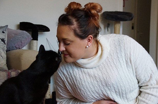 Noget andet som har hjulpet hende meget er hende to katte. Når angstanfaldene bryder ud, kommer kattene og lægger sig ved hende. Derfor betragter hun dem som terapi-katte. Det hjælper hende, fordi hun er bange for at være alene, og hendes omgangskreds i Randers er lille. Kattene giver hende tryghed.