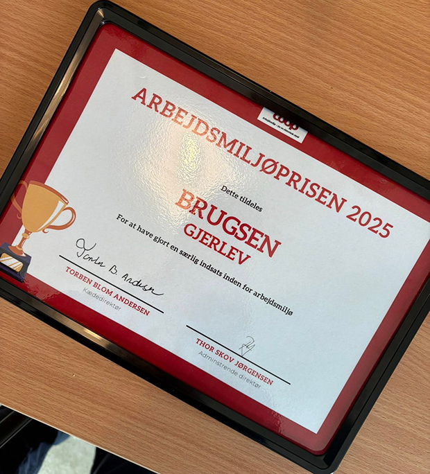 GJERLEV – Når man træder ind i Dagli’Brugsen i Gjerlev, mærker man det straks. Den gode stemning, grinene mellem kollegerne, og den ægte lyst til at være der. Det er netop denne atmosfære, der har sikret butikken førstepladsen som Årets Arbejdsplads på arbejdsmiljø blandt 270 brugser i Danmark.
