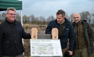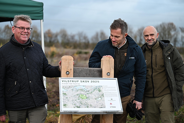 Vilstrup Skov er resultatet af et fælles projekt mellem Naturstyrelsen, Randers Kommune og Verdo Vand. På billedet fra venstre: Borgmester Torben Hansen, Jesper Møller Larsen, divisionsdirektør for Energi og Forsyning i Verdo, og Uffe Strandby, Skovrider ved Naturstyrelsen Kronjylland. Foto: Randers Kommune.