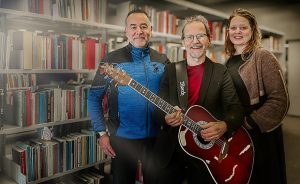 Jens Sørensen og Marie Garsdal Brøsted vælger sange til eftermiddagssang i januar 2026. Peter Elmelund (i midten) akkompagnerer. Foto: Randers Bibliotek.