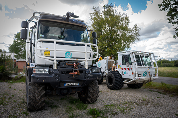 - Vibrationslastbilen til venstre vil være den mest anvendte ved målingerne. Den lille til højre vejer betydeligt mindre og anvendes på områder med større fugtighed og følsomt underlag. Pressefoto.