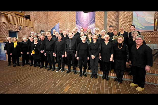 Koret er klar til at fylde kirkerummet med vellyd, og de fremmødte inviteres med på et par fællessange, så der lægges op til en stemningsfuld aften.