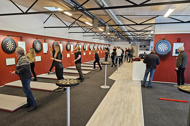 Den nye elitedivision i dart afholder første arrangement hos Randers Dart Clubs nye lokaler på Hvedevej i nordbyen. Billedet er fra åbent hus 8. februar. Privatfoto.