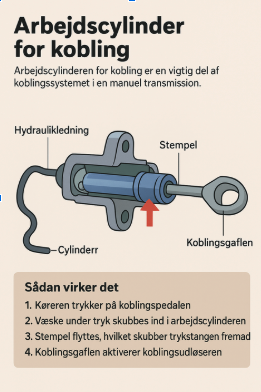 Som illustrationen viser, består arbejdscylinderen for kobling af flere kritiske komponenter, der arbejder sammen i en præcis sekvens. Cylinderen modtager hydraulikvæske gennem hydraulikledningen, som skaber tryk på stemplet inde i cylinderhuset. Dette stempel er direkte forbundet til koblingsgaflen, som udgør den mekaniske forbindelse til selve koblingsmekanismen.