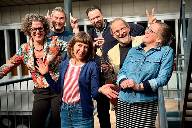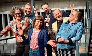 Inger Nygaard Kaad, Henrik Secher Nielsen, Louise Boel, Martin Minka, Peter Elmelund og Rebecca Muck Jepsen fortæller om sjove bøger i ny bogcafé. Foto: Randers Bibliotek.