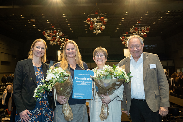 - Fagleder for klima i DANVA, Miriam Feilberg (tv) og DANVAs administrerende direktør, Carl-Emil Larsen overrakte i forbindelse med Dansk Vand Konference i Kolding DANVAs Klimapris 2025 til Lisa Melgaard og Susanne Jensen fra Vandmiljø Randers for klimatilpasningsprojektet Storkeengen. Foto: Jonas Ahlstrøm.